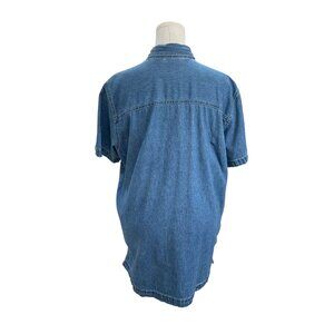 Adorable vintage-inspired Bobbie Brooks denim short-sleeve shirt featuring an intricately embroidered floral design with playful orange tabby cats and colorful songbirds on each chest panel. The embroidery includes blooming flowers, vines, and tree branches, creating a charming woodland fairy-tale aesthetic.