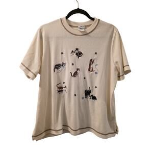Vintage Cat Embroidered Waffle Weave Shirt Tee Womens Sz MP Kittens BonWorth