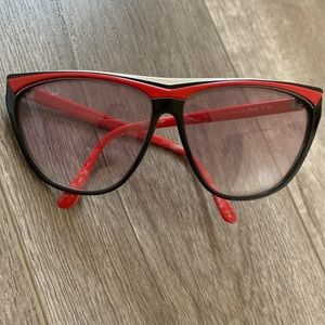 My mom rocked these fun sunglasses in the 80s. Unapologetic red accents and light gray tint. Knicks throughout the frame. Worn on the inside of the temples. Frame information: brand (Charles Jourdan) and 8628 C44. Made in France.
