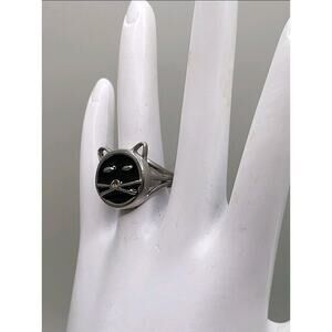 Vintage Cat Face Ring Silver Tone Black Enamel US Size 5.5