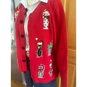 Vintage Cat Holiday Christmas Cardigan Sweater Red Button Front Women’s M
