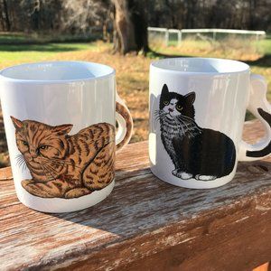 Vintage pair of 2 Cat Porcelain Mugs From The 1980’s - Matching Set Perfect For Any Cat Lover - Purrfect Mugs For Your Coffee, Tea, Or Wine (A Mug Is A Perfect Vessel For Wine) - One Mug Features A Black & White tuxedo Cat - The Other Mug Features A Moody, Brown/Orange tabby Cat. In great used condition, please see photos for condition. Photos taken in natural light. Measures approximately 3.5" tall and 2.75" wide not including the tail/handle. No brand name found. Unknown if microwave or dishwasher safe.
