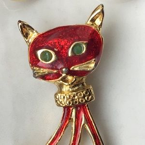 This lovely red and gold tone set offers a chic green-eyed cat with a dazzling collar.