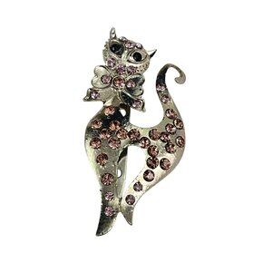 In the delightful realm of vintage accessories, this charming cat-shaped brooch pin stands out with its exquisite rhinestone detailing. Adorned with sparkling pink and purple crystals, it captures the whimsical elegance and playful spirit of feline grace. The brooch's intricate design is both an ode to the timeless allure of cats and a testament to exquisite craftsmanship, making it a treasured piece for any jewelry collection.