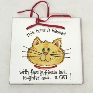 Vintage Cat Tile Blessed House Kitty Wall Plaque Ceramic Art 4"x4" Humor Trinket