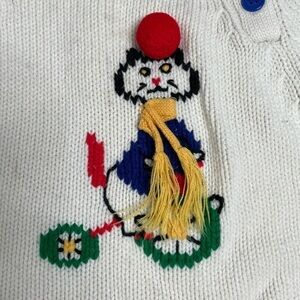Adorable vintage novelty sweater featuring a whimsical cat riding a tricycle with colorful yarn tassel details and rainbow striped trim. This cozy knit has classic retro charm and playful character, making it perfect for fall, winter, holidays, or vintage-inspired outfits. A standout piece for collectors of vintage children’s clothing or a unique gift for a toddler. High-quality vintage knitwear with full fashion construction and charming button shoulder detail for easy dressing. Rare and hard to find in toddler sizes.