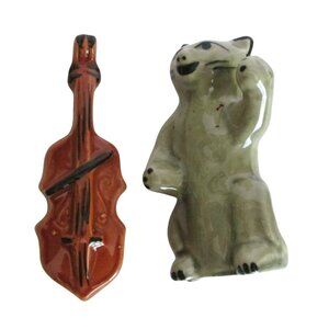 The vintage ceramic figurine salt and pepper shaker set features a cat playing a fiddle, showcasing intricate detailing and a glossy finish. Ideal for collectors or as a unique decorative piece.