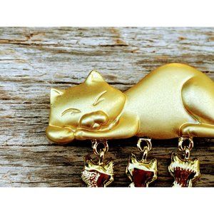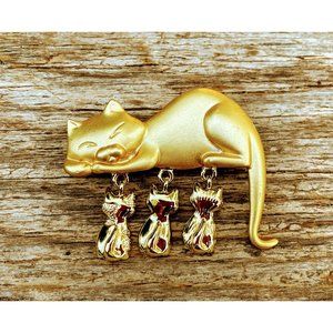 Vintage Cat with Dangle Kittens Brooch Gold tone