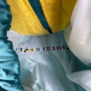 Crafted by Catalina, this windbreaker epitomizes a timeless mix of functionality and style. Its vibrant green and yellow hues, nautical flag interior, and lightweight fabric ensure a combination of visual appeal and practicality. The elasticized cuffs and hem provide a snug fit, making this jacket a comfortable companion for breezy days or outdoor adventures.