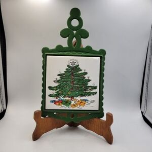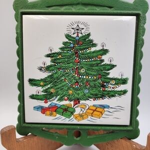 Cast iron trivet painted vintage green with ceramic tile that includes a festive & fun Christmas tree/holiday theme.