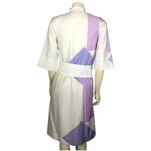 Beautiful and rare 1980s Catherine Ogust “Forever Dress” for Penthouse Gallery. This collectible design features her signature geometric abstract pattern in soft pastel tones of lilac, lavender, and white. Lightweight cotton blend with button-front closure, mandarin collar, and matching waist tie belt for a flattering adjustable fit. Timeless and versatile — can be worn belted as a dress or open as a duster. A striking example of Catherine Ogust’s modernist artwear aesthetic that remains effortlessly wearable today.