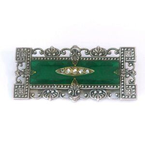 Vintage Catherine Popesco Rectangular Silver Tone Green Brooch Art Deco Nouveau