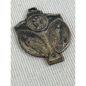 This vintage Catholic medal pendant is a charming addition to any collection. It features detailed religious imagery and a lovely patina.