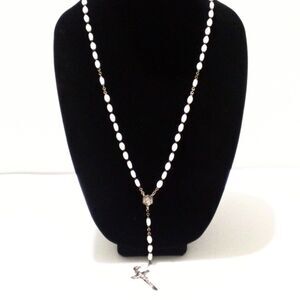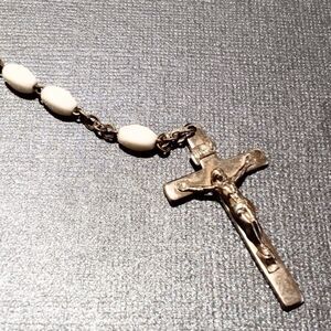 Vintage Catholic White Beaded Rosary Silver Tone Crucifix & Center Medal