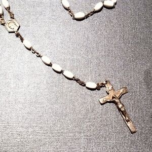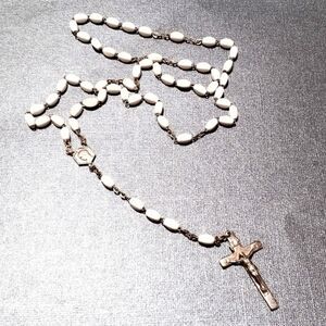 This vintage Catholic rosary is fashioned with white oval-shaped beads and silver tone accents. At the center is a medal of the Holy Mother, leading down to a finely detailed silver tone crucifix. Measuring 24 inches in length with a 5 1/4-inch drop, it is a beautiful devotional piece designed for prayer and meditation. Beyond its spiritual use, this rosary also makes a meaningful collectible for those who appreciate Catholic religious artifacts. In lovely vintage condition, it is ideal for both daily devotion and display.