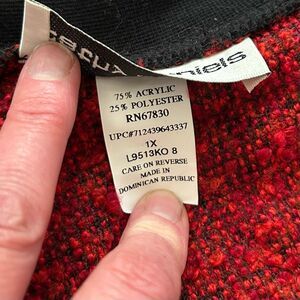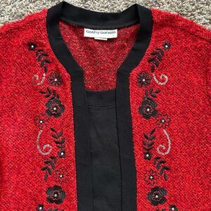 Cathy Daniels, embroidered cardigan, red bouclé jacket, floral sweater, 1X, layering piece, holiday cardigan, vintage-inspired knit