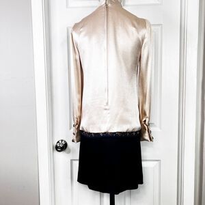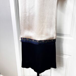 Stunning. It has a beautiful shine and a luxurious look. The cream top is attached to a navy blue skirt, which is divided by an embroidered detailed band. Talon zipper pull and plastic zipper. No noticeable care tag but the tag does have material, style number and size. The detailing on the buttons is the perfect addition to this dress. Zipper closure in back. Long sleeve.