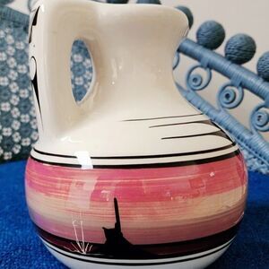 GORGEOUS NAVAJO WATER PITCHER.HANDCRAFTED AND SIGNED NAVAJO CERAMICS DEPICTING A STUNNING SCENE OF MONUMENT VALLEY IN THE MOST BEAUTIFUL SHADES