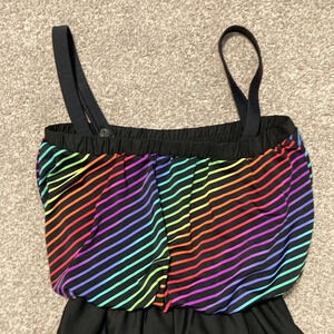 Vintage Ceeb gold label blouson swimsuit. Fully lined, excellent condition, care/size tag removed. Bottom is black and has full back coverage. Blouson style top has rainbow colored stripes on black background, elastic waistband and top. Straps are completely removable so that it can be worn strapless. Appears to be approximately size M, please see photos for measurements. From smoke free and pet free home.