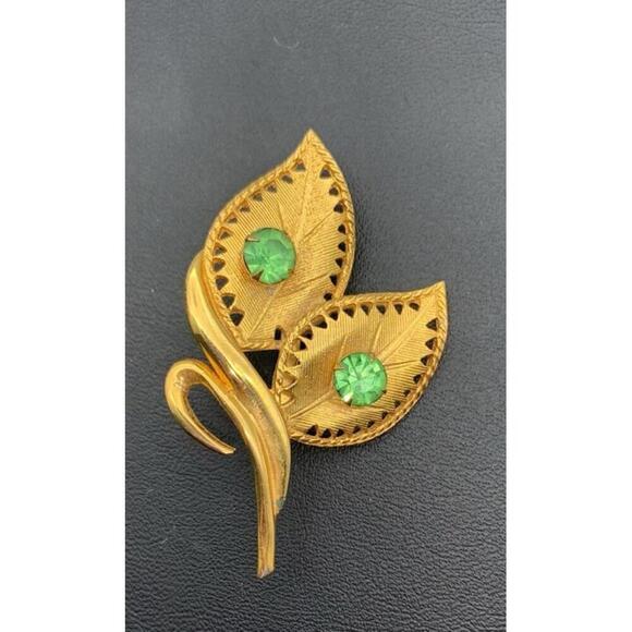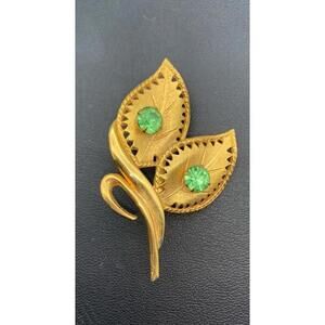 Vintage Celebrity Gold Tone Leaf Leaves Brooch Pin W Green Rhinestones Signed