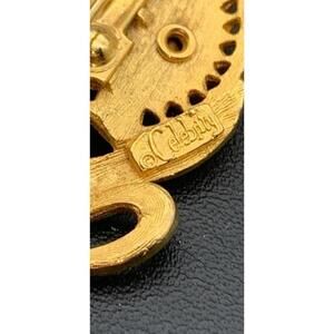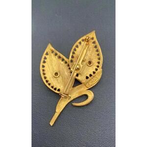 This Vintage Celebrity Gold Tone Leaf Leaves Brooch Pin with Green Rhinestones is a stunning piece of retro jewelry from the 1935-1950 era. Featuring a leaf shape design with prong settings, this signed brooch is a unique accessory for various occasions such as Christmas, birthdays, anniversaries, and weddings. The gold tone metal and green rhinestones add a touch of elegance, making it a standout piece for any fashion-forward woman looking to add a vintage touch to her outfit.