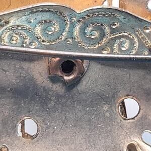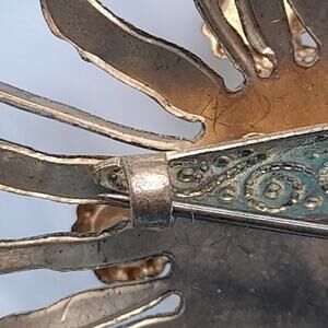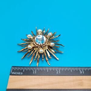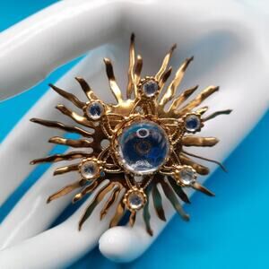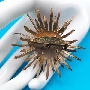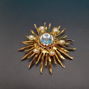*Description: This is a vintage sun stars inspired brooch with clear cabochons on a golden brass from the late 1940s to 1950s. The clasp is a c clasp and the construction is a rivet in the center back which also holds the clasp. This is a rustic brooch with a mid-century modern design. This would be a great addition to your jewelry collection or make a great gift!