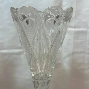 Stunning Set of 2 Vintage Goblets. Antique EAPG Ohio Flint Glass Dunkirk Diamond pattern with stars around rim and base, ornate textured design clear glass cone shaped Vase, scarce. This beautiful vase with ornate twist design, waffle diamond and stars pattern and scalloped rim would make an elegant display with flowers for any occasion. It is 9" high x 3.75" across the opening. The inside of the vase is 4.75" high. This piece is older, but in very good condition with no chips or cracks. It would make a unique gift, perhaps with some fresh flowers added.
