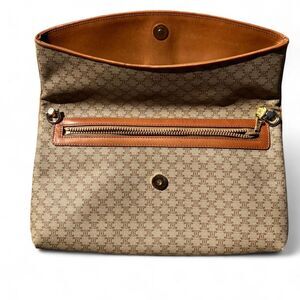 This is a very versatile authentic Celine clutch in the iconic Celine logo canvas. This piece is in beautiful shape. There have been attachments added to add a shoulder strap to make this a cute little shoulder bag. You can also change out that strap for a gold chain or make a crossbody! (I only included the shoulder strap). It has so much life left. It’s in great condition inside and out. It’s approximately 12.5” x 7”