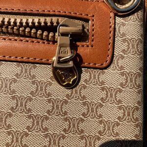 celine logo, canvas clutch, convertible bag, gold chain option, versatile accessory, vintage designer, structured pouch, classic print, shoulder strap, crossbody convertible