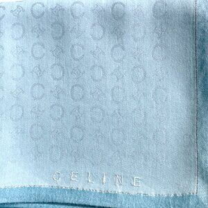 This vintage Celine cotton scarf features a subtle tonal logo pattern with a delicately embroidered CELINE logo at the edge. The silver thread border adds a refined touch, making it both understated and elegant.