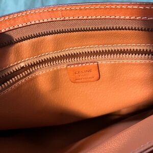 Beautiful vintage Celine clutch. Camel leather trim with light wear (see photos). Interior is clean and divided into two sections. Interior zipper does not work. Price reflect this. Gorgeous bag authenticated by The Real Real.