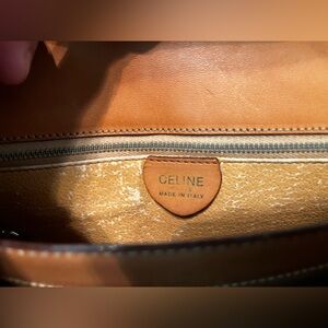 Brown Vintage Celine Macadam coated canvas Crossbody bag. This was won in an eBay auction through a Japanese seller. Price reflects the strap and peeling interior, but I’ll consider reasonable offers as well. The coated canvas itself is in great condition. Also pictured is the front closure. It’s a little different, where the top flap goes through the little pin before the clasp will close. Please comment if you have any questions!
