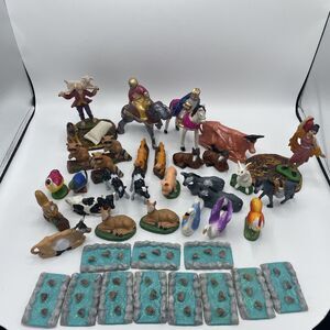 Items in this lot are in good condition, there is some wear. 1 of the donkeys has a broken foot and there seems to be a missing piece on the girl figures platform. This vintage lot includes pieces of celluloid material with various animal, people, and river designs. Some of the pieces are duplicates. Unique pieces.