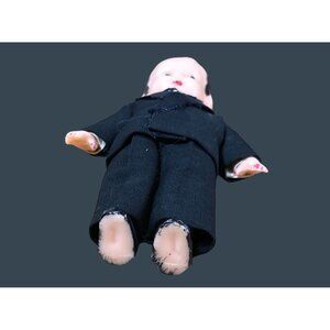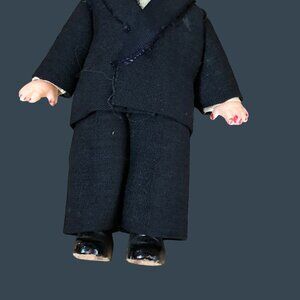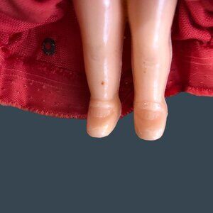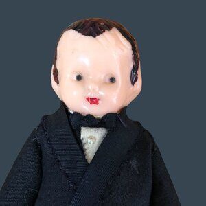 A charming pair of vintage celluloid dolls, crafted as a bride and groom. The bride flaunts a red velvet dress adorned with rhinestones, perfect as cake toppers.