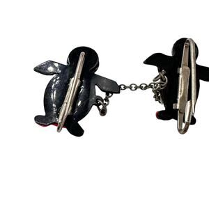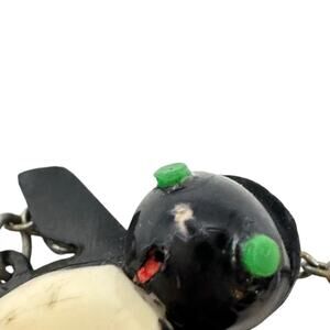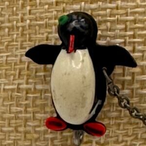 Vintage Celluloid Dual Penguin Brooch Scatter Pins Sweet but flawed the larger one is about 1 inch and the smaller is about 3/4 inch long.  Attached by a silver tone chain.