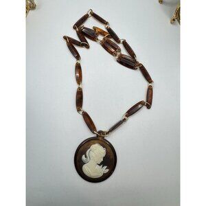 The pendant features a beautiful cameo shape in a rich brown color, made of celluloid material with a gold tone metal setting. The necklace is 34 inches long.