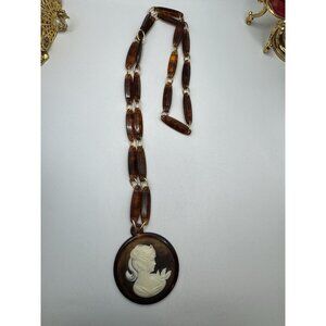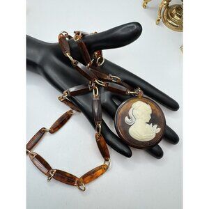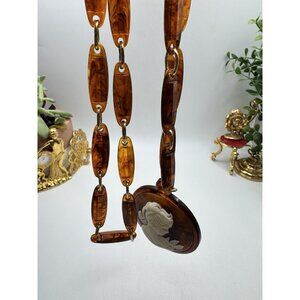 This Vintage Celluloid Faux Tortoise Cameo Chain Link Pendant Necklace is a stunning piece of fashion jewelry for women.