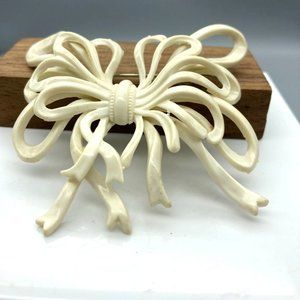 Vintage Celluloid White Bow Brooch, Dimensional Thin Ribbon Lapel Pin with Whispy Design