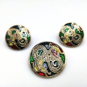 *Description: This vintage jewelry set by Sold'or Miracle is a Celtic design with colorful cloisonne enamel and signed on all pieces. The brooch is also a pendant with a bail on top and the earrings are post earrings. This set is from around the 1980s. This would be a great addition to your jewelry collection or make a great gift!