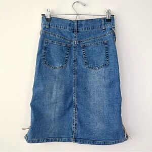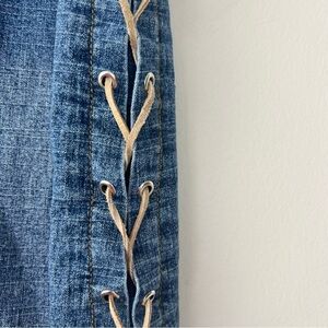 Vintage Central Park Lace Up Denim Midi Skirt. the leather ties on each side have each torn in one spot, but are tied together and not noticeable when worn. otherwise in great condition!