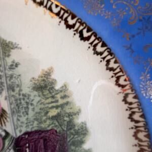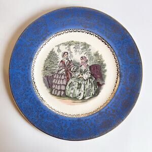 Vintage Century by Salem plate. Gorgeous cerulean blue background with 23 karat gold decoration. Center of plate has an image of two ladies in period costume, in the style of Godey’s Ladies Book. Good condition - there is what appears to be a small flaw at the 2 o’clock position - see photos. Some crazing. Approximately 10.75” in diameter.
