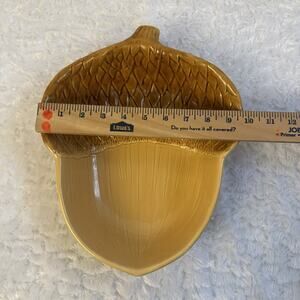 This is a vintage ceramic candy dish in the shape of an acorn, featuring a glossy finish and decorative design. It is a large serving dish that is yellow in color, with a single compartment for storing candies or other snacks. The dish was manufactured in the 1990s and is part of the Harvest theme, making it a perfect addition to fall decor.