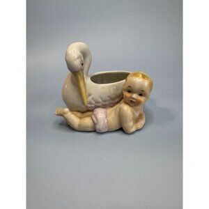 Vintage Ceramic Baby & Stork Planter Figurine Made In England 4 3/4" X 4 1/2" Nu