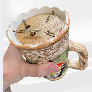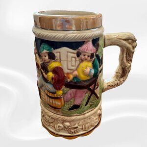 Unique and collectible, this vintage ceramic beer stein doubles as a music box for an added touch of charm. Decorated with a colorful tavern scene featuring figures in traditional attire, this stein showcases detailed craftsmanship and a rustic handle designed to look like wood. The base houses a wind-up music box mechanism (tested, plays when wound), making it both decorative and functional.