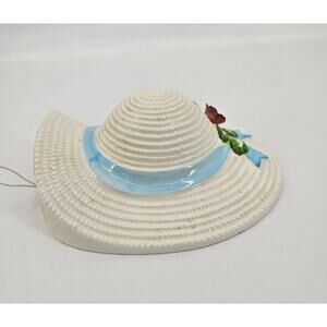 Sweet vintage ceramic wall pocket shaped like a woven straw hat, accented with a light blue ribbon and two red flowers with yellow centers. Textured detailing mimics real straw weave. A perfect piece for a cottagecore, shabby chic, or garden-themed wall! Hang loop is still attached. Estimated 1950s–1970s era