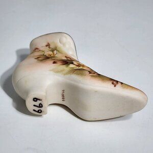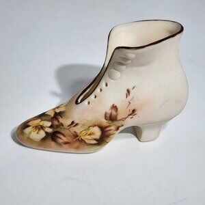 This delicate ceramic boot vase features an antique floral motif with soft, hand-painted colors. Its unique shape and intricate details evoke timeless elegance, making it a nostalgic decorative piece. A charming relic from a bygone era, ideal for collectors or adding vintage refinement to a space.