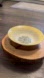 Vintage Yellow and White ceramic bowl with a detailed green pattern. Perfect for decor or serving. There is a small area of discoloration on the underside of the upper edge as shown in a loaded pic. It’s not seen on the top. There are no chips. This is a really pretty bowl.