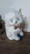 The figurine is a white cat with blue eyes and a bow tie.