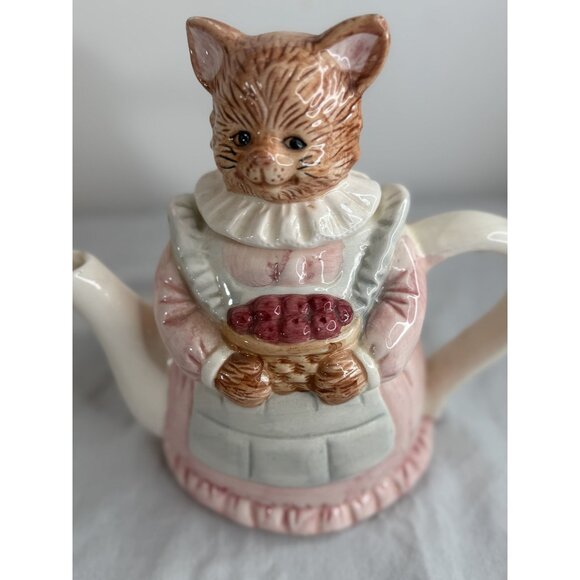 This vintage ceramic teapot combines practicality with charm. Its cat-shaped design in a pink dress holding berries adds character to tea settings or display collections.