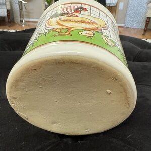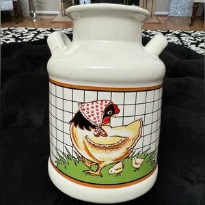 Vintage Ceramic Chicken Hen Crock Jar Jug Kitchen Utensil Holder Country Farmhouse Decor. Excellent vintage condition. Adorable mama hen in bonnet with two chicks on the front with a black & white square checkered background. See pics for measurements. Smoke & pet free home. Bundle to save - I have lots of vintage decor!